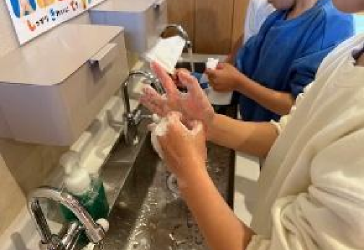 手洗いの仕方だけでなく、手洗いの大切さがわかるようにお話をします。最初はしっかり洗えているか先生が確認していますが、「次はお山のポーズだよ」「あー、おおかみのポーズやってないよ!」と、子どもたち同士でもチェックし合っている様子が見られます。