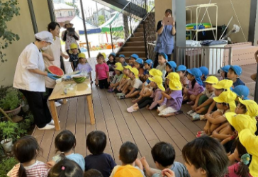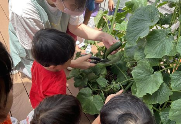 当園では野菜を育てて収穫したり調理保育などを通して「食」への興味・好奇心を育てています。