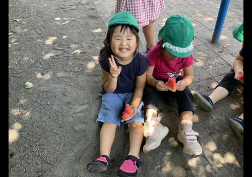調理の先生にカットしてもらい、園庭で種を飛ばしたりしながらスイカを食べました。