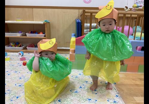 0,1,2歳児は各保育室で、お祝いをしたり、お楽しみを見たり。。。0歳児は大好きなバナナ体操のために衣装を着ました。